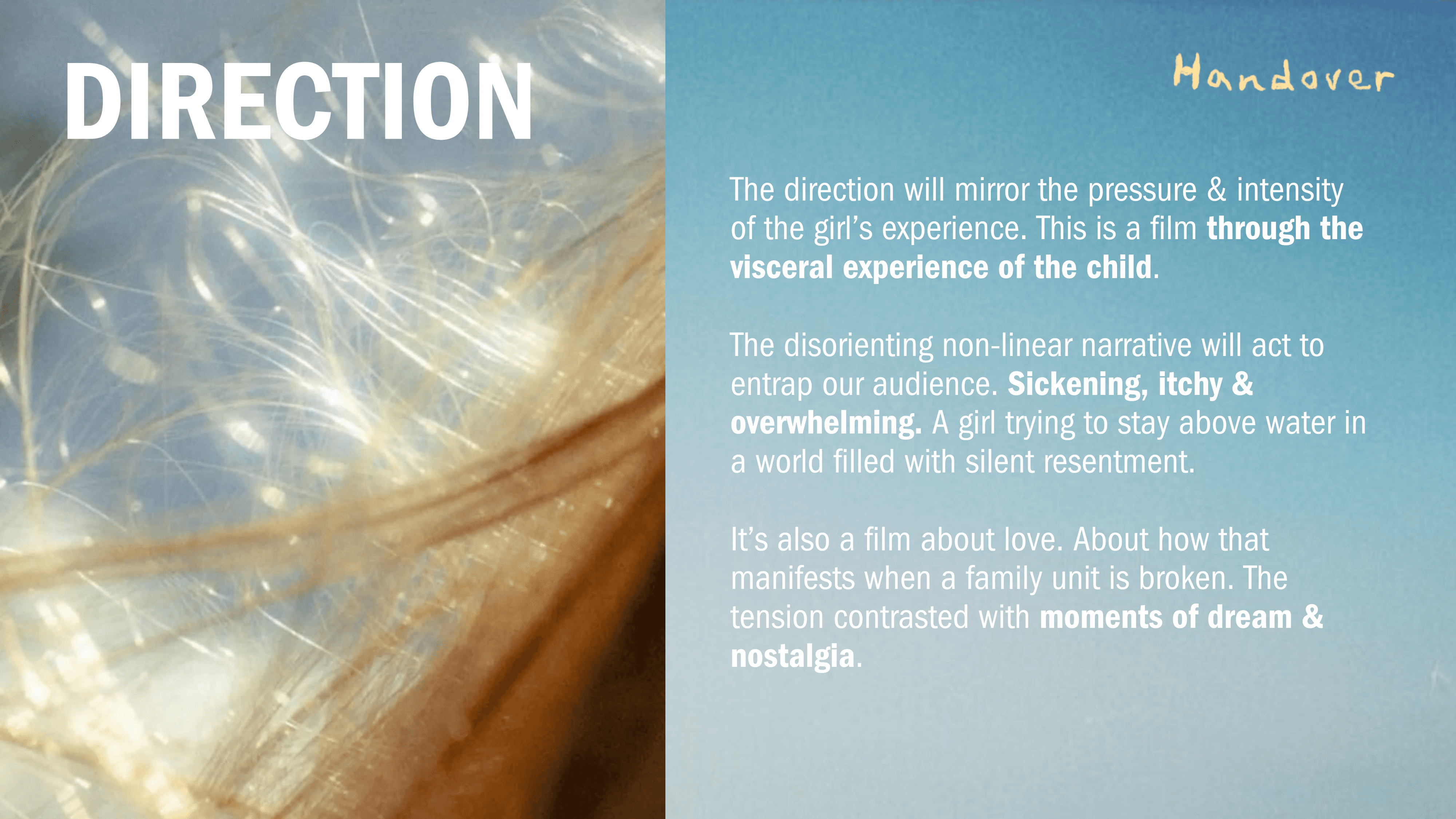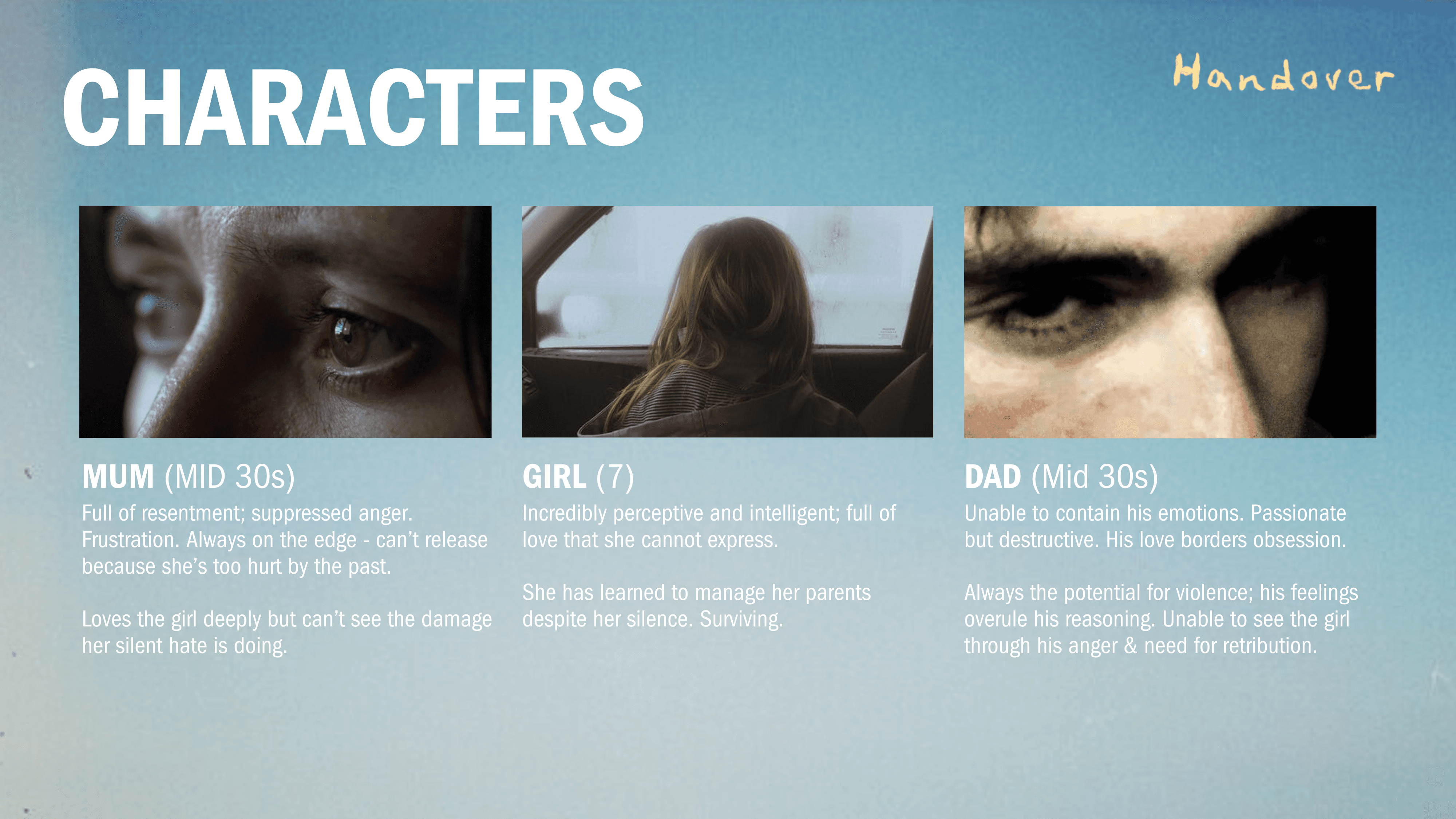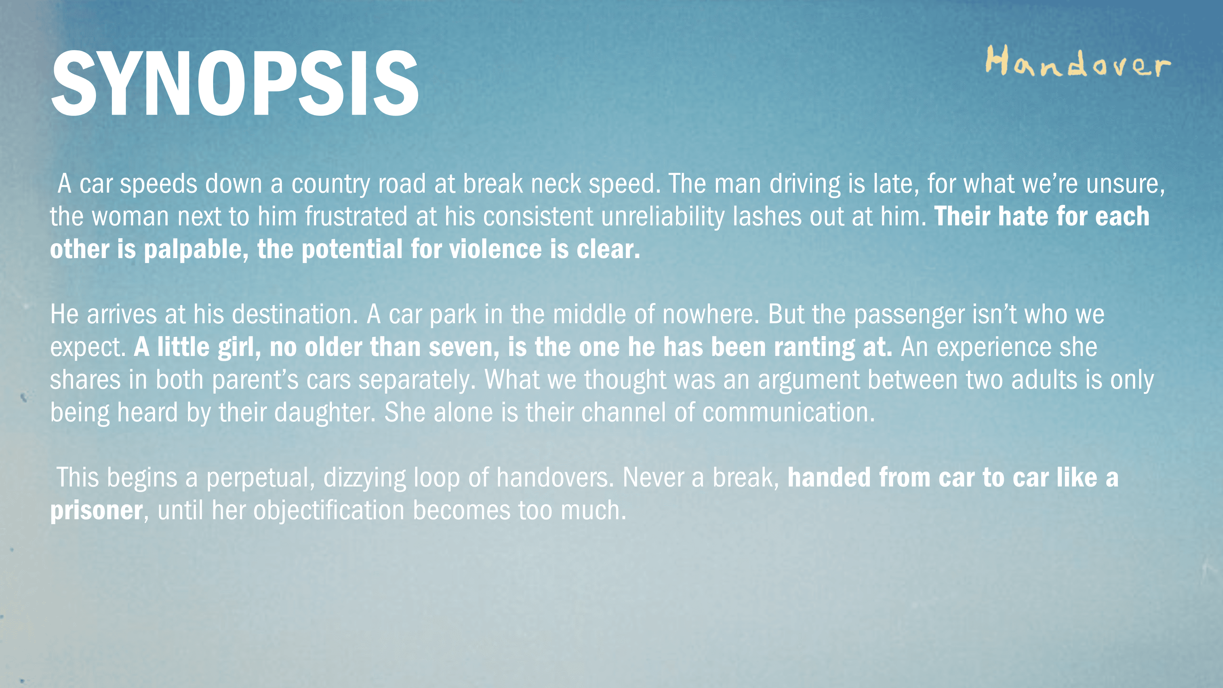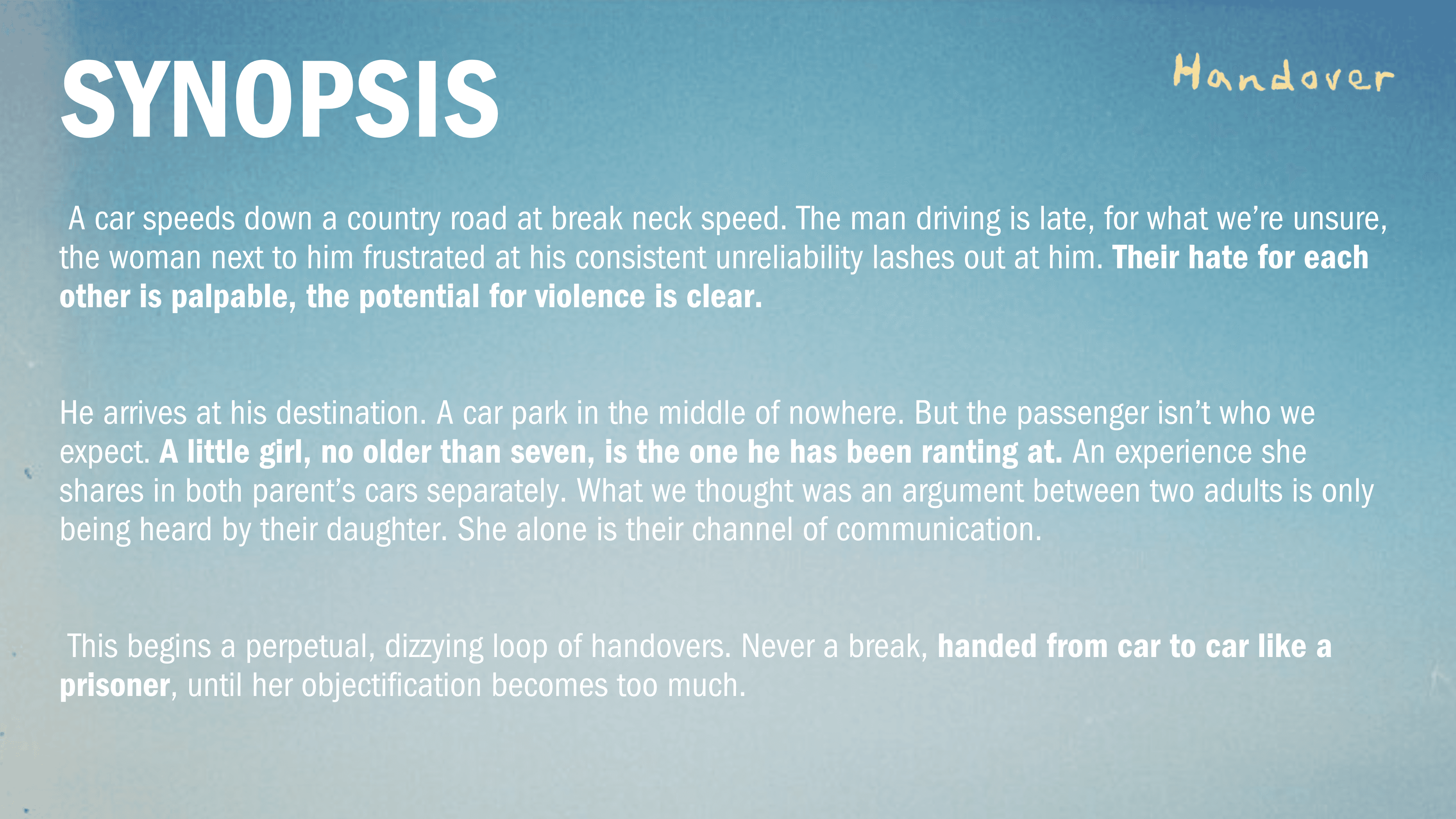 He arrives at his destination. A car park in the middle of nowhere. But the passenger isn’t who we expect. A little girl, no older than seven, is the one he has been ranting at. An experience she shares in both parent’s cars separately. What we thought was an argument between two adults is only being heard by their daughter. She alone is their channel of communication.
